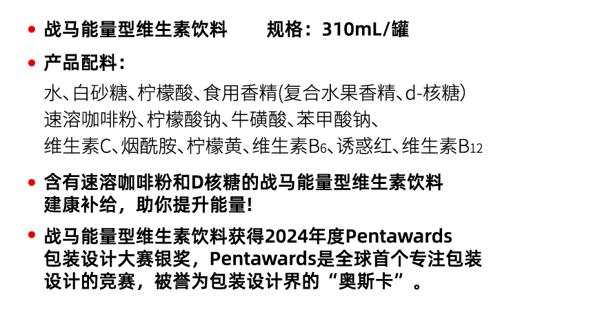 戰(zhàn)馬能量型維生素飲料是華彬快速消費(fèi)品集團(tuán)2017年推出的能量型飲料品牌,產(chǎn)品包裝擁有醒目的紅色,觸手可知的顆粒觸感,每個(gè)細(xì)節(jié)都力求質(zhì)感。戰(zhàn)馬產(chǎn)品含有速溶咖啡粉、d -核糖、?;撬?,幫助飲用者迅速恢復(fù)能量。